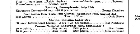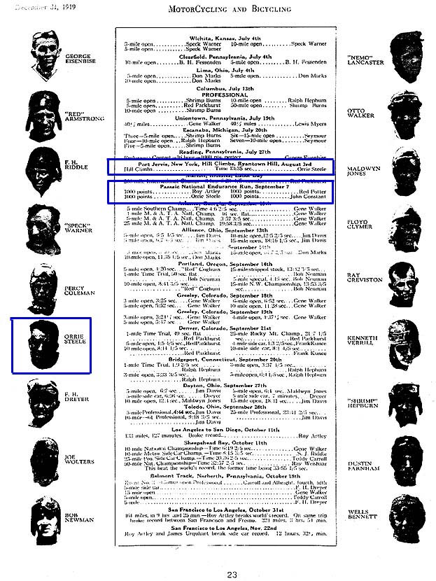 These latest images and text came to me courtesy of Daniel Statnekov. I saw Daniel's site on the history of motorcycle racing from 1900 to 1930 and sent him an e-mail asking if he had anything about my grandfather. Sure enough he did. This is from the December 31, 1919 edition of Motorcycling and Bicycling It is a list of winners from the 1919 season that used Goodyear tires. My grandfather is listed twice, just look for the blue outlines. Below are close-ups of the listings of the events he won. Also if there is someone else listed that you would like info on. Just e-mail me, I will scan that section for you.