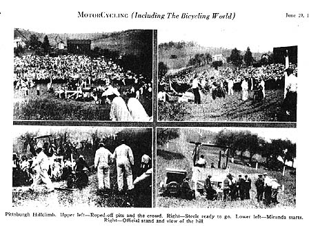 PITTSBURGH PA., June 3 - Another successful Hill Climb has passed into history in Pittsburgh Town, once more the Gods of the air and elements were kind and the Great God Mammon smiled on the efforts of Greater Pittsburgh Motorcycle Club in their attempt to put over a real event that would live in the minds of the spectators for many days after the last rider had topped the slope. That the effort was successful goes without saying, the boys are still talking about that last ride of Orrie Steele and Bernard Thanner in running off their third tie and which resulted in the crowning of that Red Whirlwind Orie, King of the Hill. The old cash register played a merry tune and the treasurer of the Club, Charlie Phipps, now wears a smile that threatens at times to entirely disconnect the upper part of his face from the lower half.